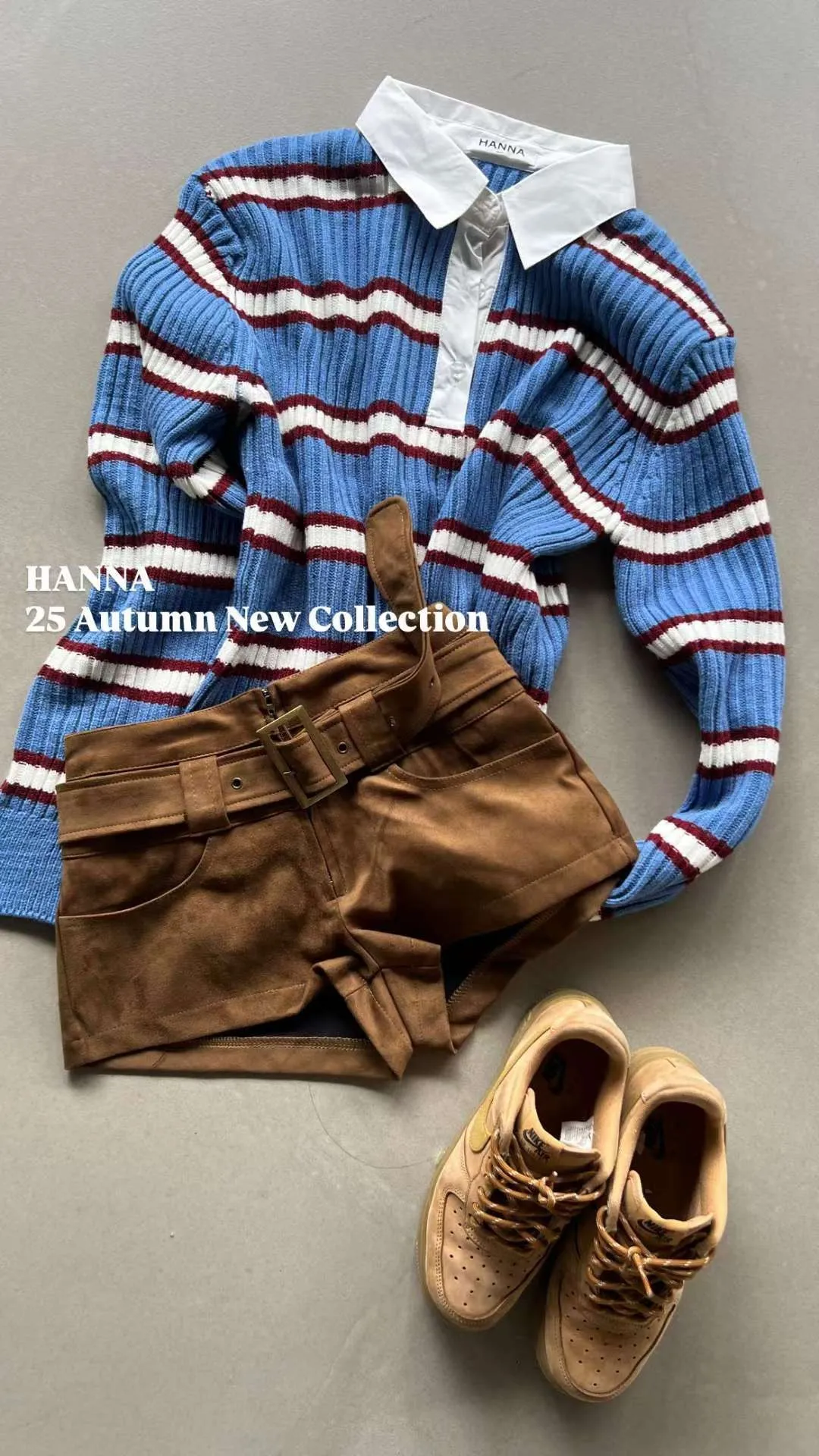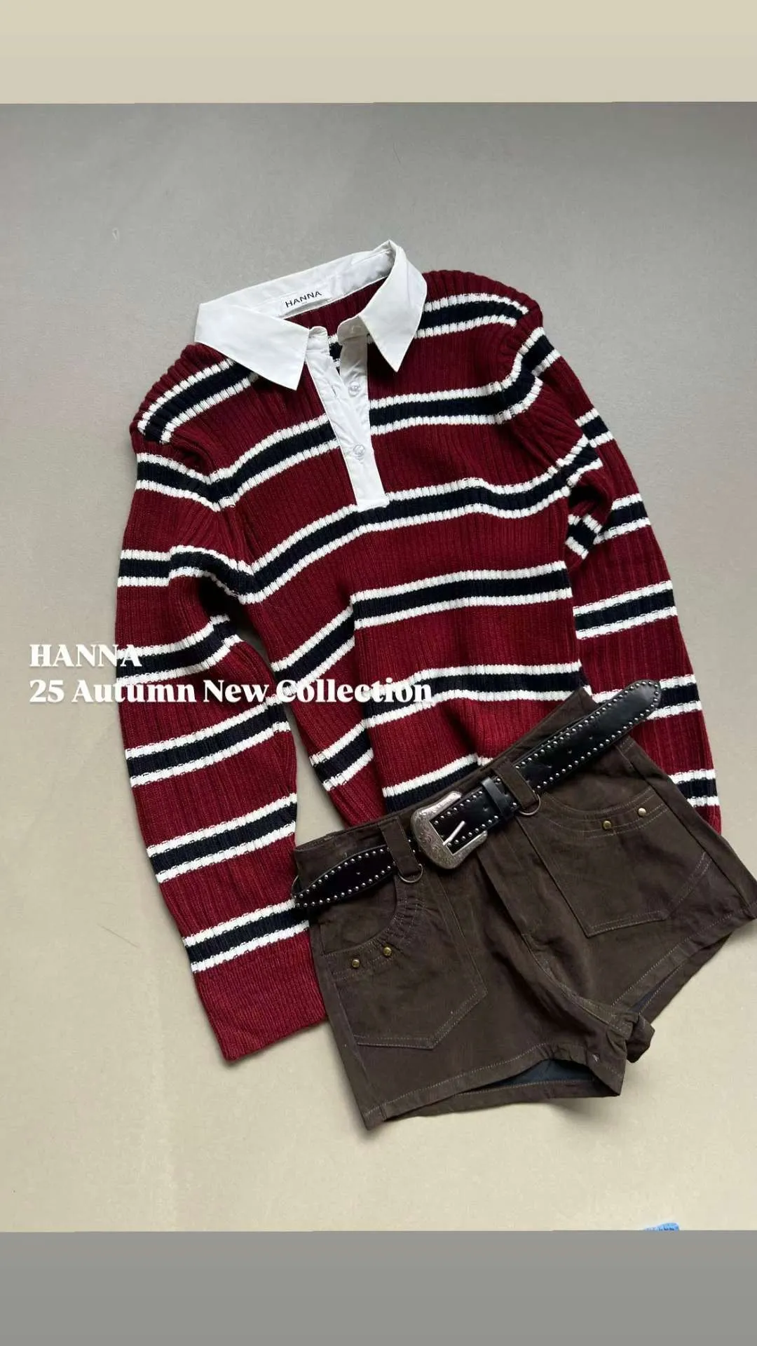 厚磅坑條針織,搭配白色翻領設計