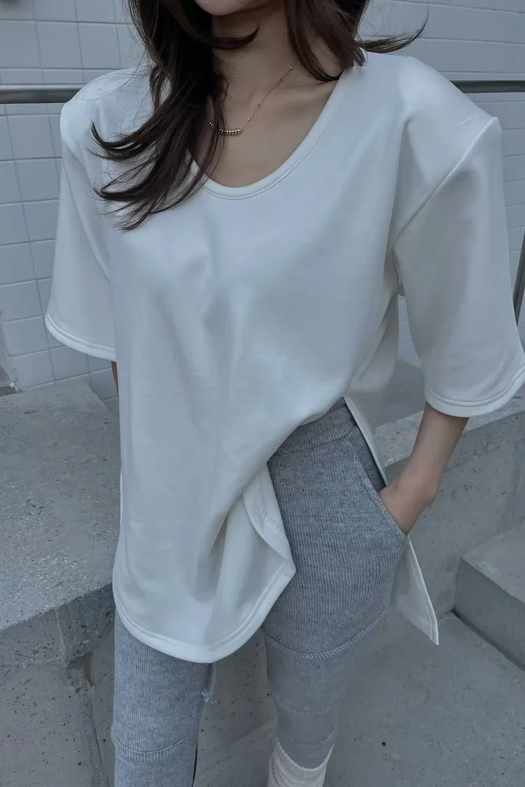 側邊大開衩、下擺圓弧修飾骨盆
