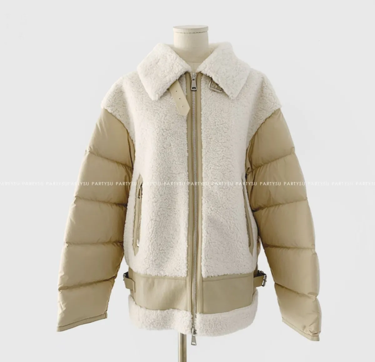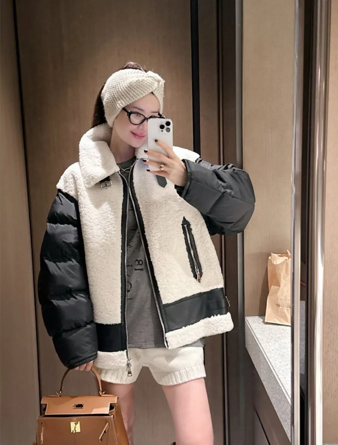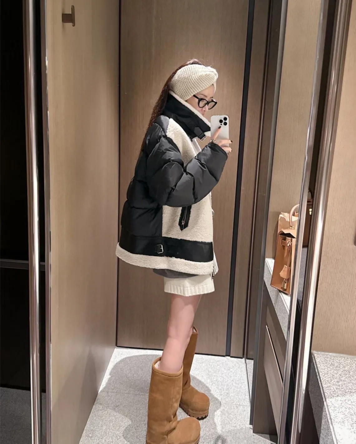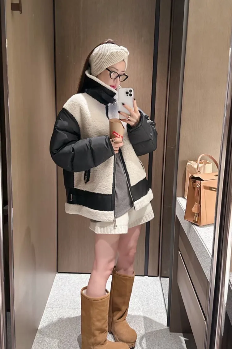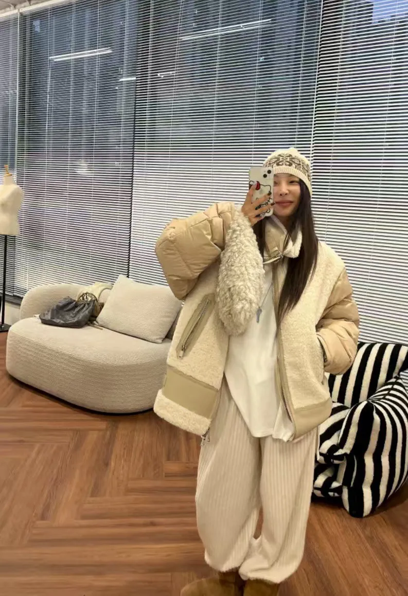 它是「羊羔絨+羽絨」的拼接外套,份量感超美、超挺,穿起來不會臃腫,反而超級顯瘦!!