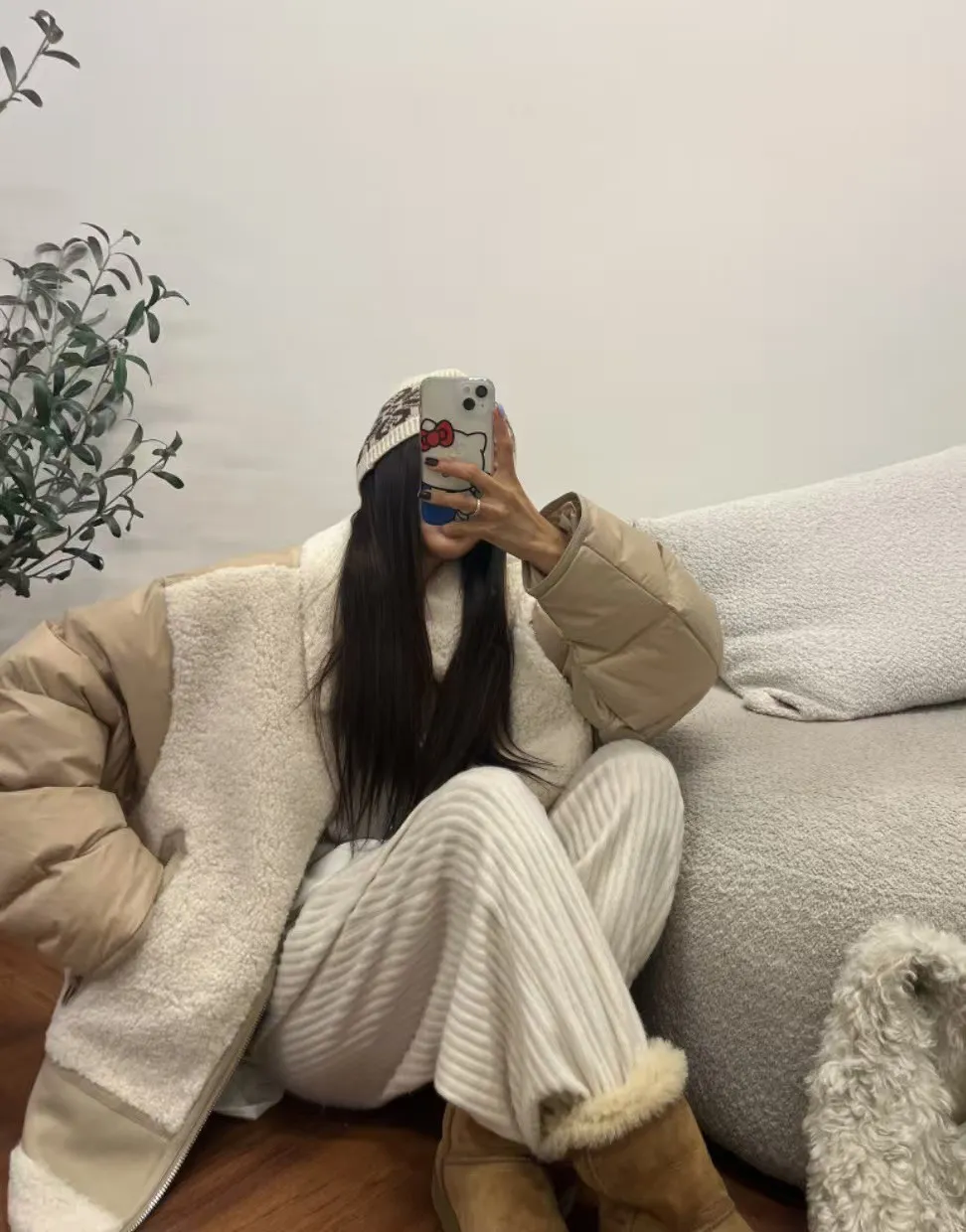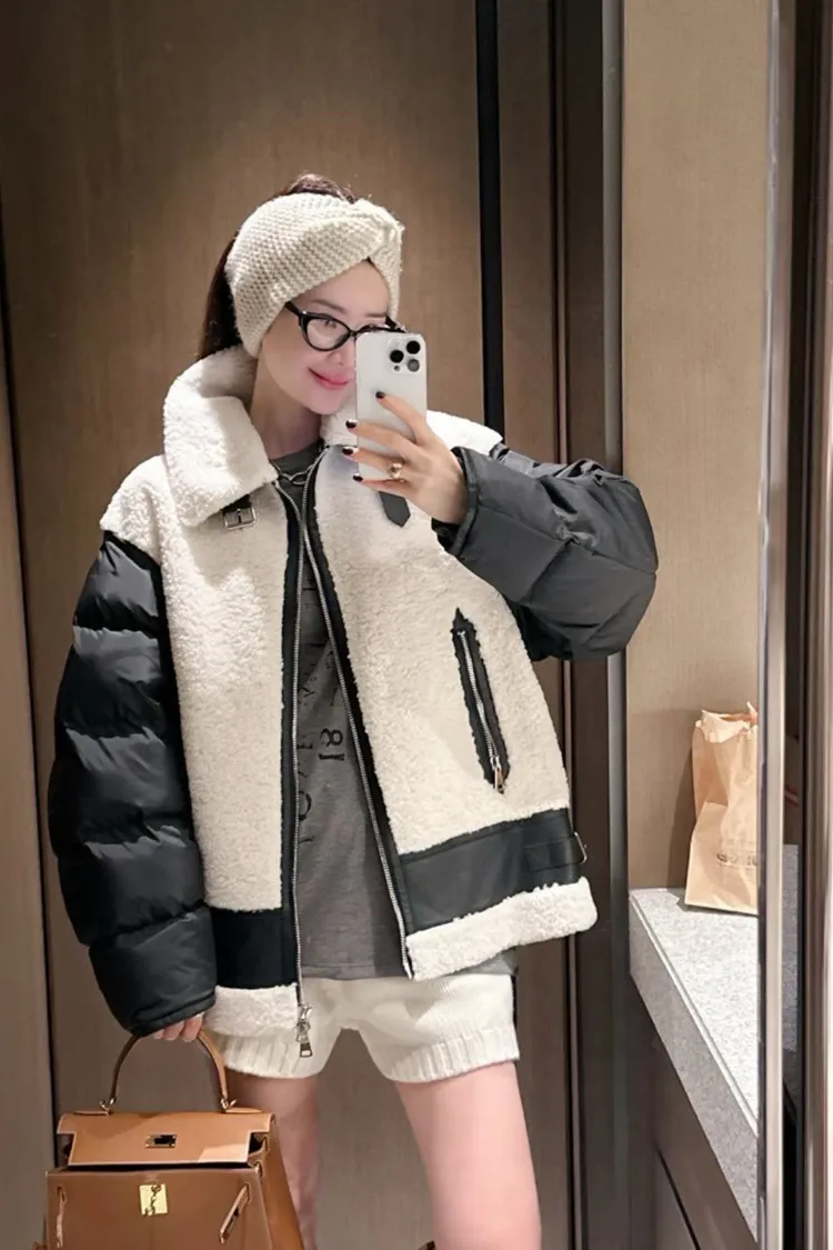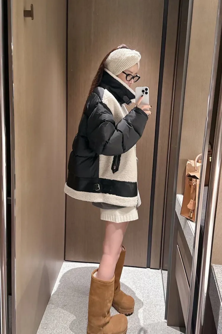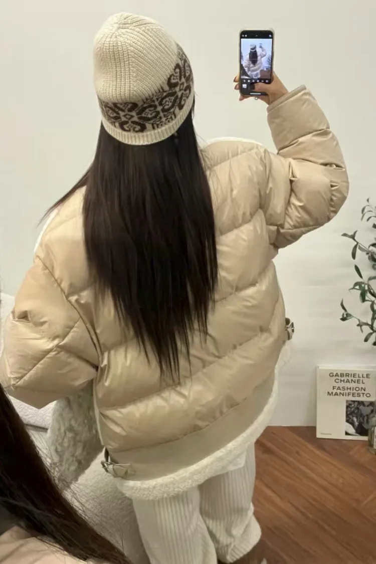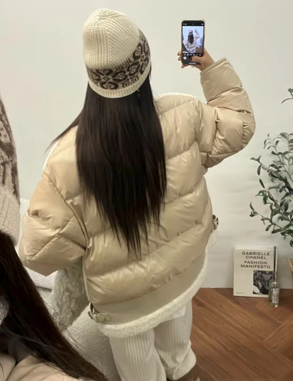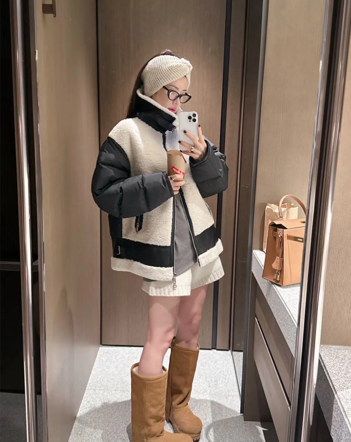 它是「羊羔絨+羽絨」的拼接外套,份量感超美、超挺,穿起來不會臃腫,反而超級顯瘦!!