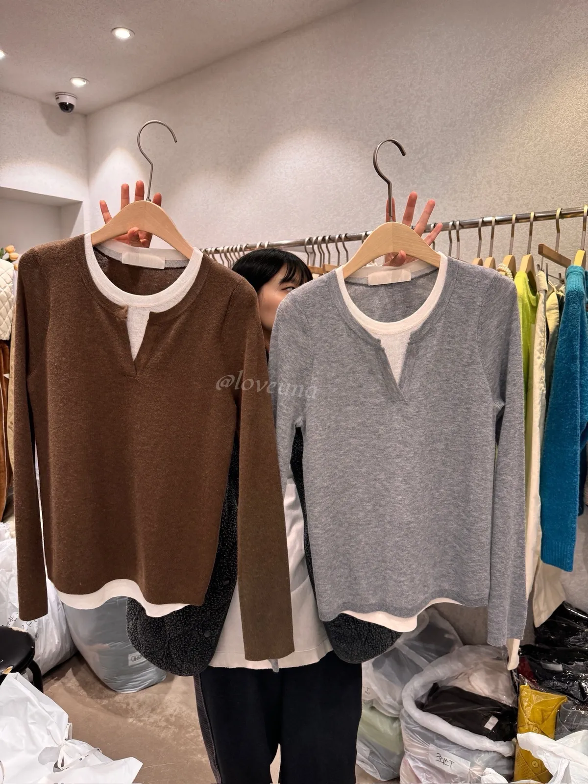 假兩件撞色拼接長袖T恤修身顯瘦打底衫內搭上衣