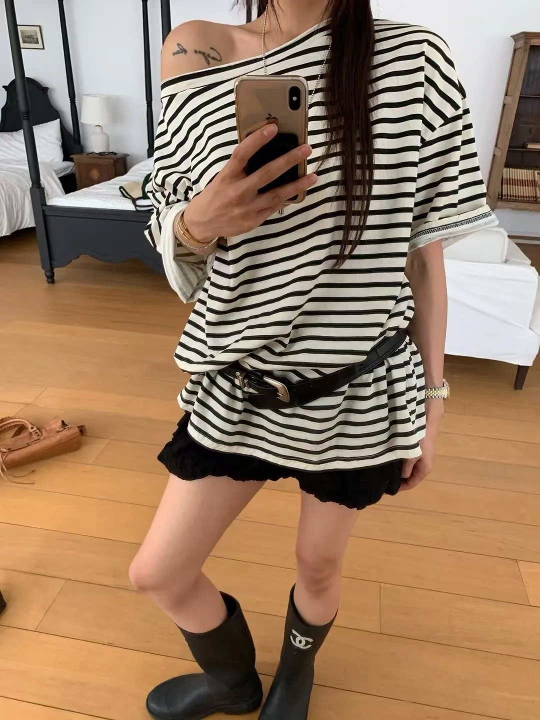 穿搭建議:可以學模特兒搭配短褲+長靴,也可以綁腰變成小洋裝感~